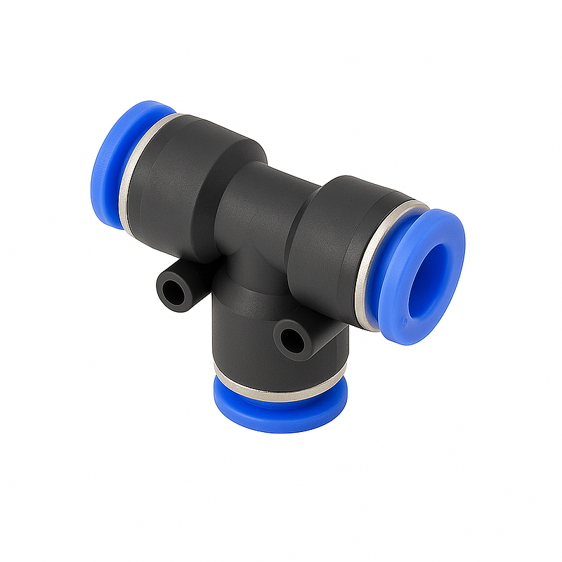 Es una pieza en forma de “T” que permite derivar el flujo en sistemas de aire comprimido. Su conexión es directa, rápida y sin necesidad de herramientas.