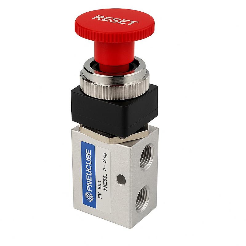 Sí. Su botón rojo y mecanismo de bloqueo lo hacen ideal como pulsador de parada de emergencia neumático, especialmente en líneas de producción.